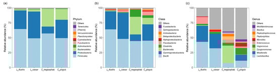 The gut bacterial communities of the four species exhibited distinct compositions at the genus level (Figure 1c). The genera Bacillus (1.33%), Dysgonomonas (7.67%), Enterococcus (5.01%), Lactobacillus (23.53%), Moellerella (15.36%), Myroides (2.44%), Peptoniphilus (1.42%), Peptostreptococcus (1.38%), Vagococcus (5.21%), and Wohlfahrtiimonas (1.31%) were present across the species. Lactobacillus was dominant in L. illustris (32.25%) and L. caesar (43.07%). C. megacephala prominently hosted Dysgonomonas (29.50%). Conversely, C. pinguis exhibited a balanced distribution of Lactobacillus (11.48%), Moellerella (10.05%), and Vagococcus (10.87%).