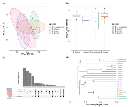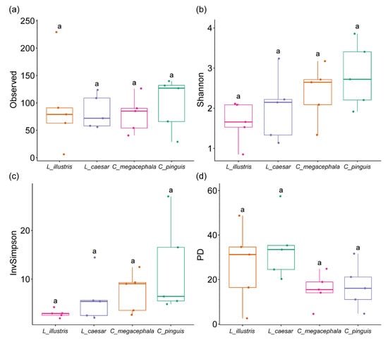 Regarding observed species richness, no significant differences were detected among C. pinguis, L. illustris, L. caesar, and C. megacephala (H = 1.080, p = 0.782) (Figure 2a).