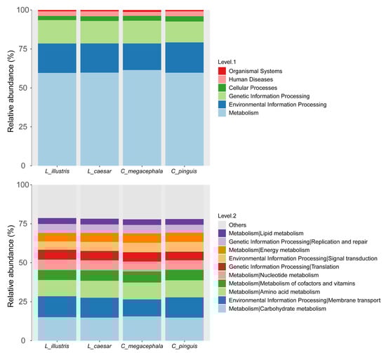 Actinobacteria, Bacteroidetes, Firmicutes, and Proteobacteria were the predominant phyla in the gut microbiota of the four necrophagous fly species. The relative abundances of these phyla fluctuated among the species: Firmicutes was prevalent in C. megacephala and L. illustris, while Actinobacteria dominated in C. pinguis and L. caesar. Notably, Lactobacillus was consistently present in significant amounts across all species, emphasizing its likely importance in their ecology and physiology [,]. In the fly gut, Lactobacillus potentially influences developmental processes. However, the probiotic attributes of Lactobacillus can vary based on the specific strains []. As a primary metabolic facilitator, Lactobacillus might play a crucial role in decomposing and fermenting the organic matter found in the carrion diet, ensuring nutrient uptake and thereby enhancing fly survival and reproduction []. Its potential immunomodulatory properties could also fortify the flies against pathogenic threats [,,,,,]. Hence, the prevalence of Lactobacillus may signify an adaptive symbiotic relationship that shapes the biology and ecological adaptability of these flies [,]. In light of the Sloan’s neutral model predictions, it is noteworthy that the genus Lactobacillus, despite its prominence in our discussion and its significant representation in the gut bacterial communities, aligns with the model’s neutral expectations. This suggests that the occurrence and distribution of Lactobacillus across the four fly species might be governed by neutral processes rather than specific deterministic factors. While several genera were observed to deviate from the model’s predictions, either being above or below, Lactobacillus was neither overrepresented nor underrepresented in comparison to the model’s predictions []. Despite these foundational findings, we observed significant overlap in bacterial taxa across all species, suggesting a core bacterial community resilient to seasonal variations. Notably, the functional profiles remained consistent, pointing to factors beyond mere seasonality that shape these communities [].