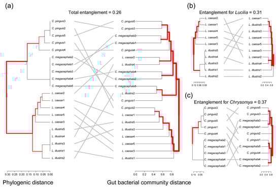 Examination of correlation between phylogenetic distances among fly species and gut bacterial community distances. (a) Combined analysis for Lucilia and Chrysomya. (b) Analysis specific to Lucilia. (c) Analysis for Chrysomya. The red, bold lines indicate groups of species that are consistently clustered in both dendrograms, suggesting a strong correlation between their phylogenetic relationships and gut bacterial community compositions.