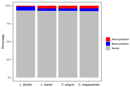 Further insights were obtained from an analysis of deviations from the neutral model predictions (Figure 7). For L. caesar, 9 microbial genera were observed above, and 8 below the model’s prediction, while 221 were consistent with neutral expectations. L. illustris showed 3 genera above and 13 below the predictions, with 222 fitting the neutral model. Both C. megacephala and C. pinguis presented 9 genera above and 9 and 8 genera below the predictions, respectively, with each having 220 and 221 genera aligning with the neutral model.
