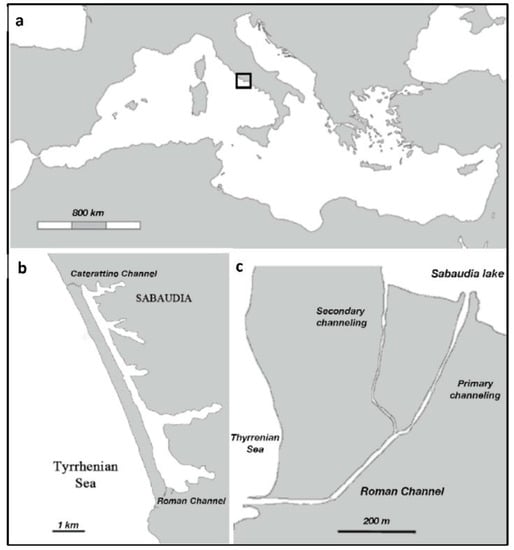 Study area. Sabaudia Lake, located in central Italy, Tyrrhenian Sea (a), is connected with the sea by two channels (b); details of Roman Channel and its primary and secondary channellings (c).