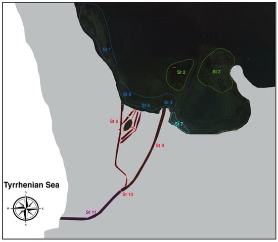 Aerial view of sampling stations (St 1–St 11) and distribution of different habitats. Green: muddy bottom with seagrass and algae; blue: Cymodocea nodosa meadows; light blue: dense colonial ascidians populations with low hydrodynamism; red: composed macro-invertebrate guilds with medium–high hydrodynamism; violet: predominantly marine habitat with high hydrodynamism.