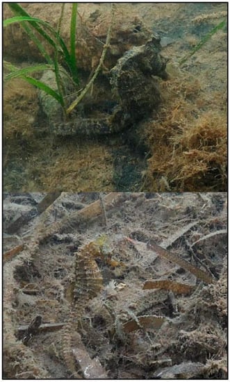 - Gristina, M.; Cardone, F.; Carlucci, R.; Castellano, L.; Passarelli, S.; Corriero, G. Abundance, distribution and habitat preference of Hippocampus guttulatus and Hippocampus hippocampus in a semi-enclosed central Mediterranean marine area. Mar. Ecol. 2015, 36, 57–66. [Google Scholar] [CrossRef]