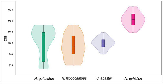Size distribution of Hippocampus guttulatus, H. hippocampus, Syngnathus abaster, and Nerophis ophidion.