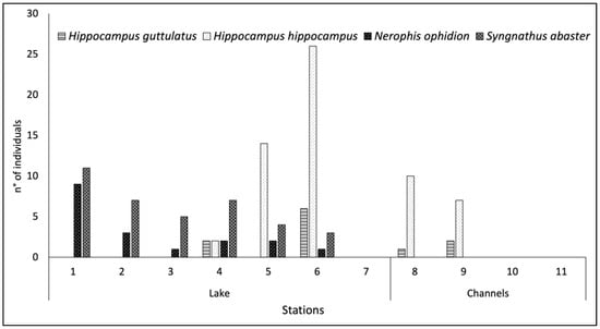 N. ophidion had the widest distribution, being found in the innermost area (St 1, St 2, and St 3) in co-occurrence with S. abaster as well as near the two inlet areas of the primary and secondary channels (St 4, St 5, and St 6). At St 8 and St 9, only H. hippocampus and H. guttulatus were found. No syngnathid species were recorded at St 7 (located in a bend of the basin), St 10, or St 11 (directly influenced by marine inputs) (Figure 5).