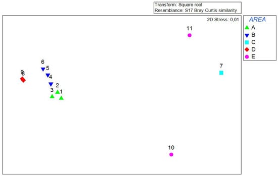 Differences in syngnathid assemblages composition at each station were assessed using an nMDS analysis of the abundance matrix based on square root transformed data. Five areas were identified in relation to their position with respect to communication channels with the sea, namely (A) the innermost parts of the area influenced by tidal currents (St 1–3), (B) inlet areas of different channellings (St 4–6), (C) an internal and protected area almost excluded from tidal influence (St 7), (D) a secondary channelling and its starting point (St 8 and 9), and (E) the Roman channel (St 10 and 11). To test the significance of the observed differences among stations, ANOVA was performed on the abundance matrix using the same experimental design. Data were analysed using the Bray-Curtis dissimilarity measure on square root transformed data with 9999 permutations of residuals under a reduced model. All analyses were performed using PRIMER 6.0 software.