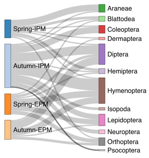 The diet composition of investigated spiders was compared based on their hunting guild, season (autumn or spring), and type of pest management practice. Spider hunting guilds were classified according to Cardoso et al. (2011) [49]. The analysis used binary data, i.e., the presence or absence of prey orders in the gut [50], and the prey prevalence in the gut of spiders was a response variable composed of the number of spiders in each orchard that consumed that specific prey category and those that did not consume this prey category. Because we analyzed the prey prevalence of spider guts based on the guild, the data were not independent. Therefore, we compared the data using generalized estimating equations (GEE) via “geeglm” in the “geepack” package in R v.4.2.1. [51] with binomial distribution and exchangeable correlation structure to account for the dependencies [52]. Additionally, we visualized differences using Sankey plots via “SankeyNetwork” in the “networkD3” [53] package in R v.4.2.1 [51].