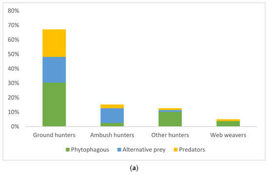 Differences in the predation of spiders from different hunting guilds and management types were compared based on the economic importance of prey. The prey species recorded in the gut were classified into three groups: phytophagous prey, alternative prey (including detritophages, parasites, and pollinators), and predatory invertebrates (www.cabi.org/isc, last accessed on 29 September 2022). The number of specimens counted in the spider’s gut system and divided into the aforementioned groups was included in the analysis and was analyzed by the factorial analysis of variance (ANOVA) in TIBCO Statistica 13.5.0. program [54].