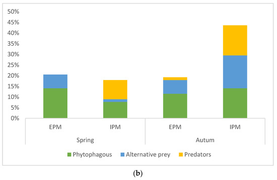 (a) Percentage of occurrence of different prey groups (phytophagous, alternative, and predatory prey) in the guts of spiders from different hunting guilds, and (b) in two seasons (spring and autumn) within both pest management types (EPM—ecological pest management and IPM—integrated pest management).
