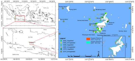 The research stations in Karimunjawa waters. The 2019 stations are indicated by stars (6 stations: vegetated and 9 stations: unvegetated). The 2020 stations are indicated by triangles (10 stations: vegetated and 5 stations: unvegetated). Meanwhile, the 2022 stations are indicated by circles (7 stations: vegetated and 7 stations: unvegetated). Seagrass and sediment carbon measurements were carried out in both 2019 and 2022, while measurements of air–sea CO2 flux were taken across the years 2019, 2020, and 2022.