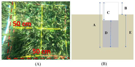 OCS-Sg was calculated by multiplying the biomass of each seagrass species with the corresponding percentage of OCC [38]. Sediment sampling was carried out in 2019 and 2022 through the utilization of a sediment corer (Figure 2B). The sediment corer, comprising subsampling ports with a diameter of 5 cm, was covered during the collection of samples. Employing a manual hammer, the sediment corer was carefully driven into the sediment, aiming for a depth of 5–20 cm. Measurements of B (representing the length of the pipe outside the sediment) and C (indicating the length of the inside pipe) were executed to derive essential parameters. These measurements facilitated the computation of critical factors, including a compaction correction (CCF), a correction for core length (H’), and the acquisition of a volumetric sample. This volumetric sample was subsequently employed in the analysis of pivotal sediment characteristics. These characteristics encompass dry bulk density (calculated using Equation (4)), water content, organic matter (evaluated via Equation (1)), sediment organic carbon content (SOCC, determined using Equations (2) and (3)), and organic carbon stock within the sediment (OCS-S, derived from Equations (6) and (7)).
