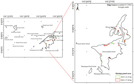 The shrimp pond areas within the Karimunjawa waters for the years 2015 and 2021.