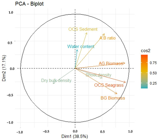 The combined effect of various predictors accounted for 55.6% of the variability observed in OCS-S (Figure 5). The outcomes of the PCA analysis revealed that the A:B ratio and water content exerted a positive influence on the OCS-S, while dry bulk density had a negative impact (Figure 5). These findings align with prior research, as noted in [19,53]. In general, a higher shoot density and greater BGB correlate positively with higher OCS-S, owing to their capacity to capture particles and accumulate Corg in the sediment, a concept substantiated by [52]. The elevated OCS-S can be attributed to the intricate canopy structure’s elevated complexity, as discussed in [19,54].