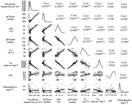 The correlations among various variables, including CO2 fluxes, pCO2sea, SST, pCO2atm, , , pH, and chlorophyll-a. The graphs visually represent the linear relationships between these variables along the x and y axes. Statistical significance is denoted by asterisks (*), with *, and *** indicating p-values of <0.05, and <0.001, respectively. The data points are represented as dots, which serve to display the spread of the data. A more tightly clustered distribution of data around a sloping straight line indicates a stronger correlation, whereas a broader dispersion suggests a weaker one. The correlation coefficient (Corr) and the orientation of the straight line together convey the strength and direction of the relationship between the variables. A positive Corr value, as well as a straight line that slopes upwards to the right and another that slopes downwards to the left, all indicate a positive relationship. Conversely, a negative Corr value, in conjunction with a straight line sloping downwards to the right and another sloping upwards to the left, signifies a negative relationship.