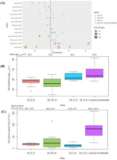 In the context of investigating the interplay between seagrass and CO2 flux in Karimunjawa waters, a distinct separation was made between vegetated stations enriched with additional carbonate sources (vegetated + source carbonate in 2022) and other seagrass-covered stations (vegetated in 2022) (depicted in Figure 7A). Drawing insights from Figure 7A, it becomes evident that three stations—Lendra, Mangrove Inn, and Menjangan Kecil—stand out due to their notably elevated levels of OCS-S and CO2 flux.