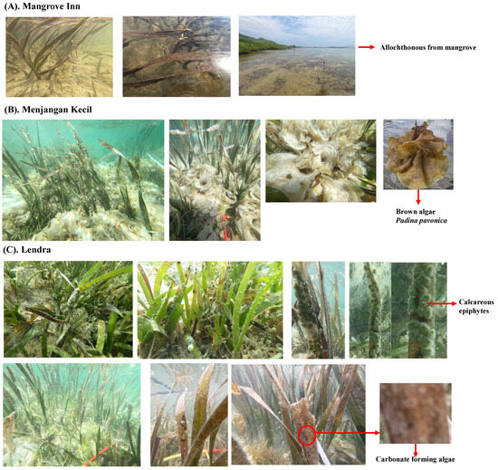 The state of seagrass within the Karimunjawa study area in 2022: (A) Supplementary allochthonous carbon input originating from mangroves; (B) the presence of calcifying brown algae, Padina pavonica; and (C) the existence of calcareous epiphytes and algae contributing to carbonate formation.