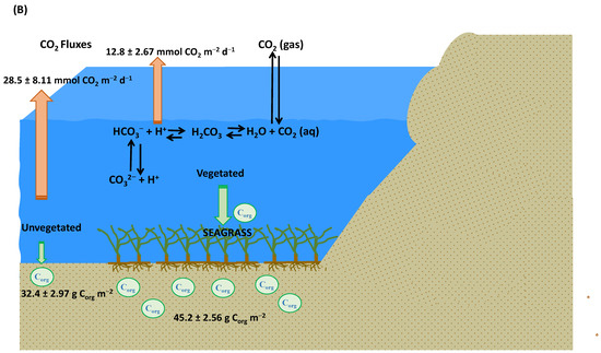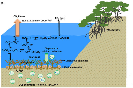The air–sea CO2 flux within vegetated regions is also subject to the influence of inorganic carbon, which can elevate pCO2sea, thereby leading to heightened air–sea CO2 exchange. This phenomenon is vividly depicted in Figure 9A, wherein the presence of calcium carbonate reservoirs within seagrass vegetation yields a notable impact on bolstering the organic carbon stores in the aquatic environment. As a result, the air–sea CO2 flux reaches an elevated level of 83.4 ± 18.3 mmol CO2 m−2 d−1. This relationship is mirrored in the sediment domain as well, with organic carbon levels reaching 53.2 ± 6.8 gCorg m−2. Various studies have asserted that the supplementary inorganic carbon within seagrass beds is contributed by sources such as mangroves [23], macroalgae [73,74,75,76], and land-based pollutants, which can lead to the colonization of epiphytes (macrophytes) [77]. Notably, additional sources of carbonate (inorganic carbon) can be attributed to the presence of mangroves in the Mangrove Inn (depicted in Figure 8A). The introduction of allochthonous carbon from upstream sources stems from contributions originating from rivers and mangroves. As elucidated by the findings of [23], the allochthonous influx of mangroves, primarily in the form of groundwater input (measured at 18.1 ± 5.8 mmol CO2 m−2 d−1), emerges as a significant factor driving the escalation of pCO2sea. This underscores the pivotal role of water in acting as a substantial source of CO2 within mangrove ecosystems.