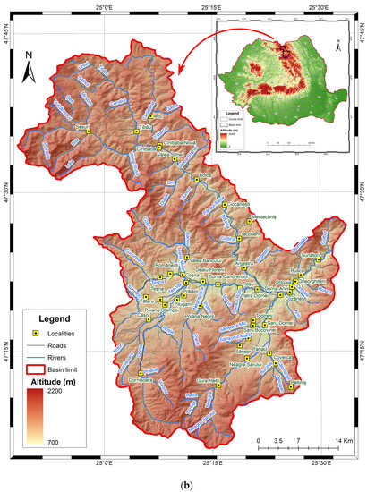 Figure 1. (a) Spatial location of the upper basin of Bistrița in Europe. (b) Hypsometric map and spatial location of the upper basin of Bistrița in Romania.