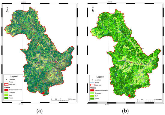 The vector dataset was processed and delineated for the study area by applying specific GIS algorithms in the ArcGIS software (ArcGis 10.1 for desktop), for which the number of classes was reduced. Thus, the delineation of the four classes “bareland/settlements”, “grassland”, “bush”, and “forest” was achieved, as shown in Table 2.