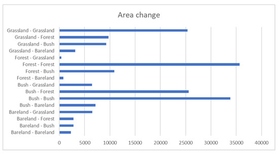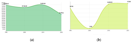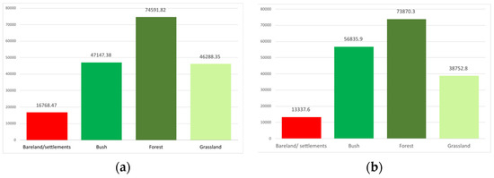 The overall results show that the pace of landscape changes was higher for the period 1990–2010 and lower for the next period (2010–2020) but significant. The classes “bareland/settlements” (Figure 7a) and “grassland” (Figure 6b) underwent the greatest changes, having an oscillating dynamic, one to the detriment of the other. The classes “forests” (Figure 6a) and “bush” (Figure 7b) underwent major changes in the period 2010–2021.