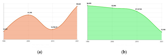 Figure 5. Evolution of land cover classes: (a) 2010; (b) 2021.