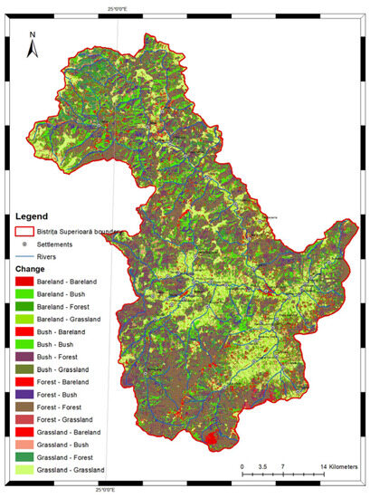 The analysis carried out allowed for the identification of a specific dynamic in terms of land cover changes in the upper basin of the Bistrița River, mainly determined by using the restitution of forest property processes in conjunction with a reduction in agricultural activities specific to the mountain area. A spatial analysis of the land cover shows a concentration of agricultural land, especially in the Dorna Depression. The location of artificial surfaces, that is, urban and rural inhabited areas, is usually along the main rivers draining into the upper basin of the Bistrița. In terms of degraded land, i.e., land covered with rubbish dumps or mining operations, the former sulphur mines in the Călimani Mountains (i.e., the stone quarries at Saru Dornei, Dornișoara, Cârlibaba, and Ciocănești) stand out.