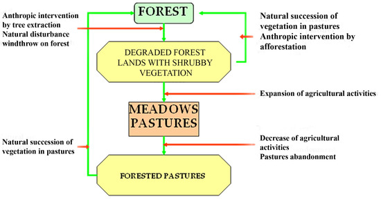 • The transition processes in land cover specific to forest lands (Supplementary Figure S5) represent dynamic and cyclical processes that can stretch over decades. At the level of the study area, the following sequence was identified between areas covered with forest and areas with shrubby vegetation, typical of the mountain area (Figure 10).