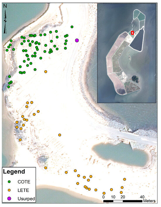 The distribution of Common (COTE; Sterna hirundo) and Least (LETE; Sternula antillarum) Tern nests located in Cell 7 of Poplar Island (Chesapeake Bay, MD, USA), active as of 7 July 2023, relative to the location of a Least Tern nest usurped by Common Terns. The red box in the inset indicates the extend of the larger image on the whole of Poplar Island. Note that while the usurped nest is far from other Least Tern nests, there is still a large area of suitable nesting habitat in both colonies. Base imagery is provided by the U.S. Army Corps of Engineers and shows ground conditions as of 2021.