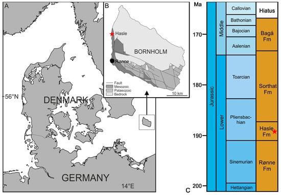 Location of Bornholm and the Hasle Formation. (A), Location map showing the position of Bornholm in the Baltic Sea; (B) outline geological map of Bornholm, showing the location of Hasle, asterisk indicates the exposure of the Hasle Formation []; (C) Lower to Middle Jurassic stratigraphy of Bornholm, modified after [].