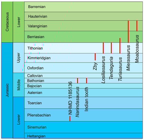 Temporal distribution of the different recognized members of the Turiasauria, based on ages given by [,,,,,,,].
