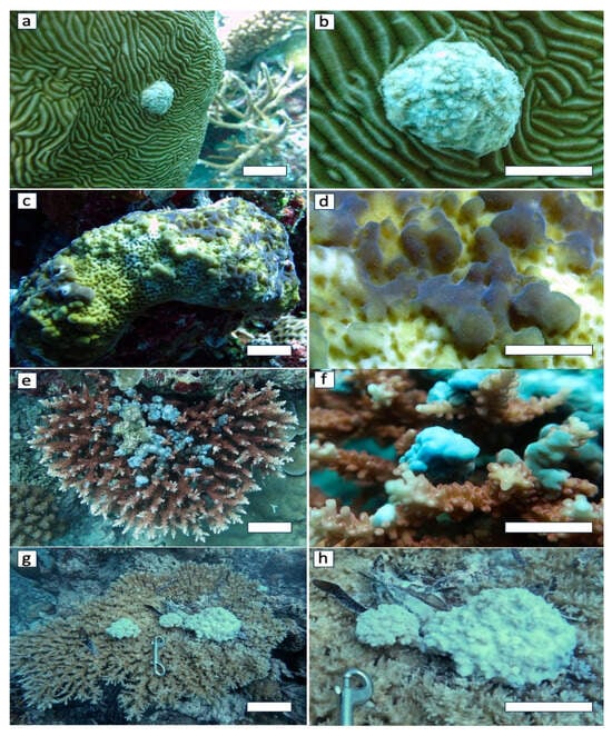 (a) Nodular growth anomalies on Pachyseris speciosa; (c) bosselated growth anomalies on Montipora sp.; (e) umbonate growth anomalies on Acropora sp.; (g) nodular growth anomalies on Acropora sp.; closer view of growth anomalies on Pachyseris speciosa (b); on Montipora sp. (d); on Acropora sp. (f); on Acropora sp. (h) (Scale bars: (a,b,e,f) 2 cm; (c,d) 1 cm: (g,h) 5 cm).