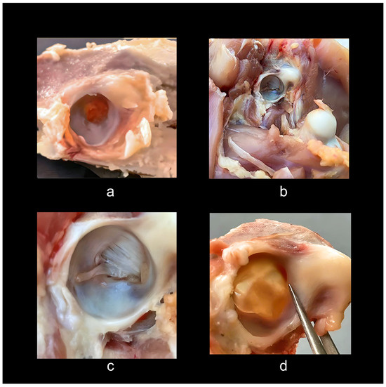 Acetabula of rotisserie chickens. These images show post-hatching additions, notably considerable cartilage, and the antitrochanter: (a) rotisserie chicken post-hatching, the acetabulum foramen near the opening, showing considerable cartilage and an almost calcified antitrochanter; (b) Poulet Rouge fully mature chicken showing a mature ossified antitrochanter and femoral head; (c) mature Poulet Rouge showing white labrum surrounding the acetabular edge, ossified antitrochanter and femoral head (note the remnant of Ligamentum capitis femoris affixes to the femoral head, helping to stabilize the femur); (d) photo light shone from the base of the acetabulum shows the extent of medial bony walls and the basin of a fibrous sheet devoid of bone. Epiphyses of rotisserie specimens are entirely cartilaginous or in the process of transforming into endochondral bone. (Rotisserie chicken acetabula, approximately 10 mm; Poulet Rouge, 12 mm). Photos and dissections by the author.