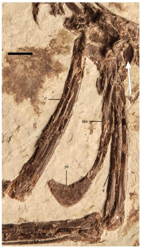 Femora and right pubis of Anchiornis, with the hip joint partially visible due to taphonomic displacement of the proximal femur, showing part of the expansive bony medial acetabular wall (arrow). Abbreviations: lf; left femur; pb, pubic boot; rf, right femur; rpu, right pubis. Image courtesy R. Pei.
