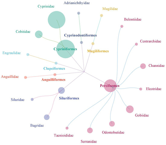 Fish species composition in Shanghai based on eDNA metabarcoding analysis. In this picture, different colors represent different orders, and the size of the circle reflects the number of fish species in that order or family.