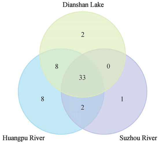 With regard to species distribution, the survey detected 51 fish species in the Huangpu River, 36 in the Suzhou River, and 43 in Dianshan Lake (Figure 4). Fish composition in the Huangpu River, the Suzhou River, and Dianshan Lake was very similar, and 33 fish species were detected in all three rivers, while 2 species were only detected in Dianshan Lake, which were Sarcocheilichthys sinensis and Siniperca chuatsi. One species, Macropodus ocellatus, was exclusively found in the Suzhou River, and eight species, including Megalobrama terminalis, Mugilogobius_myxodermus, Channa maculata, Lateolabrax maculatus, Eleotris oxycephala, Anguilla japonica, Tachysurus nitidus, and Mugil cephalus, were only detected in the Huangpu River (Figure 4).