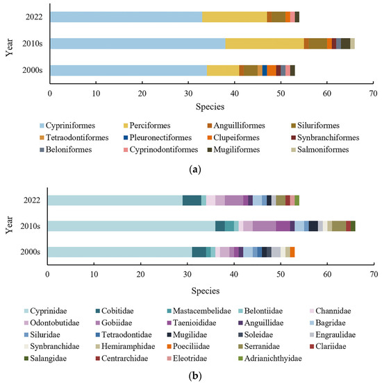 Composition of fish species in different time periods. (a) Composition at the order level and (b) composition at the family level. The results for 2022 are from this study.