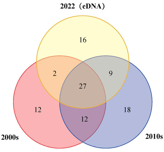 To compare the eDNA survey results with historical data obtained using traditional sampling methods [22,23,52,53,54,55], the number of fish species in Shanghai at different time periods was compiled. The survey results from the early 21st century, the 2010s, and the present study revealed 56, 68, and 54 fish species, respectively. However, it is important to note that there were cases of taxonomic changes and synonymous names for certain fish species. For example, Culter dabryi, Chanodichthys dabryi, and Erythroculter dabryi were different names for the same species. Similar cases of synonymous names were observed for C. mongolicus and Culter mongolicus, C. alburnus and Cultrichthys erythropterus, Micropercops swinhonis and H. swinhonis, and T. nitidus and Pelteobagrus nitidus. Furthermore, the classification of Chanodichthys erythropterus and Culter alburnus has changed in recent years, with C. alburnus being reclassified as Chanodichthys erythropterus and C. erythropterus as Culter alburnus. As a result, the data were recompiled for a comprehensive comparison, as shown in Appendix B.