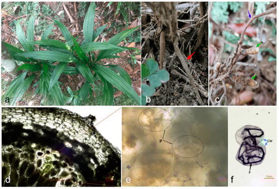 Tissues and microscopic observation of the colonization of endophytic fungi in the rhizome and root of the wild orchid Neuwiedia singapureana. The wild N. singapureana plants were sampled from National Nature Reserves in Hainan, China (a). The red arrow indicates the bare prop roots in the air (b), the green arrows indicate the rhizomes in the ground, and the purple arrow indicates the normal roots in the ground (c). The red circle indicates the location of hypha in the cortex of the root cross-section (d). The black arrows indicate the pelotons (P) of the intracellular fungi (e), the blue arrows indicate the cell wall (CW), and the black arrow indicates the intracellular fungal hypha stained with trypan blue (f).