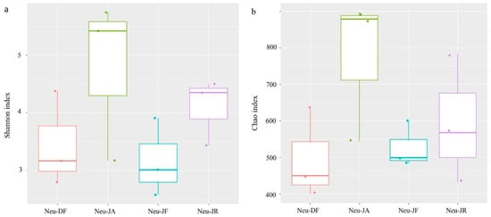 The endophytic fungal community Shannon diversity (Figure 2a) and Chao richness (Figure 2b) indexes of all samples were calculated to illustrate the complexity of each sample. The endophytic fungal diversity differed among the four sample groups but not significantly (p > 0.05). The alpha diversity was higher in Neu-JA than in Neu-DF, Neu-JF, and Neu-JR. This result suggests that the aerial roots above the ground had greater fungal community diversity and richness than the rhizomes and normal roots belowground. Moreover, the fungal community diversity and richness were slightly higher in Neu-DF than in Neu-JF, but this difference was not significant (p > 0.05).