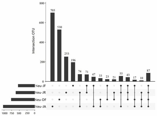 The similarities and differences in fungal communities among the different sampling groups were analyzed using an UpSet diagram (Figure 3). The diagram showed that there were large numbers of specific and common fungal OTUs among different samples. The number of specific fungal OTUs was the highest in the bare roots (Neu-JA; 703 OTUs), followed by Neu-DF (530 OTUs), Neu-JR (253 OTUs), and finally Neu-JF (196 OTUs). In total, there were 87 OTUs that were common to all four sampling groups, most of which belonged to Penicillium (Trichocomaceae), Nectriaceae, and Herpotrichiellaceae. The rhizomes from the two different collection sites (Neu-DF and Neu-JF) had 23 OTUs in common, with most belonging to Trichocomaceae. The Neu-JA, Neu-JR, and Neu-JF samples, which were from the same collection site, had 55 OTUs in common, with most belonging to Trichocomaceae and Herpotrichiellaceae (Table S1 and Figure 3).