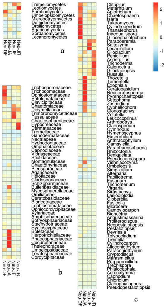 Heatmap showing relatively abundant fungal operational taxonomic units (OTUs) among the Neuwiedia singapureana sampling groups. The diversity of endophytic fungi is shown at the (a) class, (b) family, and (c) genus levels. OTUs with >1000 reads are shown. Neu-DF, the rhizomes of N. singapureana from the Diaoluoshan Reserve; Neu-JA, the air-exposed bare roots of N. singapureana from the Jianfengling Reserve; Neu-JF, the rhizomes of N. singapureana from the Jianfengling Reserve; Neu-JR, the normal roots of N. singapureana from the Jianfengling Reserve.