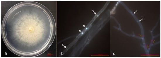 Colony morphology (a) and hyphae stained with SYBR Green I showing binucleate cells (b,c) of Epulorhiza sp. obtained from Neuwiedia singapureana rhizomes. N = nuclei; S = septa; the red arrows indicate hyphae with branching at right angles.