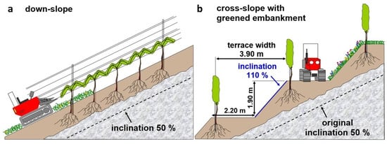 Consequently, it will be necessary to move towards a structure of vineyards which can reconcile economic efficiency with the needs of biodiversity conservation. So far, the most frequently used vineyard type is down-slope rows, i.e., the rows of vine plants running strictly cross-contour-wise (Figure 1a), hereafter called down-slope vineyards. Although this vineyard type maximises the density of crop plants and hence the quantity of wine produced, it suffers from increasingly severe problems on particularly steep slopes [], which in turn often feature the vineyards potentially supporting valuable plant and animal communities. Thus, the economic reward of managing such vineyards is often severely reduced by the high costs caused by inaccessibility to machinery and the consequent reliance on a large amount of manual labour. This results in particularly high rates of abandonment of such extreme sites []. Alternatively, these steep slopes can be planted in a contour-wise manner (Figure 1b), hereafter called cross-slope vineyards. This vineyard design allows much easier cultivation, especially if terraces are sufficiently broad for the use of standard machinery, thus compensating for the reduced quantities of wine produced. The establishment of such cross-slope vineyards results in the creation of within-vineyard embankments, which reduce soil erosion in comparison with that of down-slope vineyards, and are also assumed to be highly beneficial for the maintenance of biodiversity, if they are equipped with a cover of flowering plants (hereafter called cross-slope vineyards with greened embankments; Figure 1b).