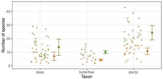 Comparison of species richness of bees, butterflies, and insect-pollinated plants in flower between vineyard types. Pale smaller points represent transect observations, while larger points with error bars represent model estimates (means and standard errors). In cross-slope vineyards with greened embankments (GEVs, green), significantly higher species numbers were recorded compared with vineyards without greened embankments (NEVs, brown; Poisson/negative binomial GLMM, Tukey’s test: p < 0.05, Table 2, Supplementary Table S3).
