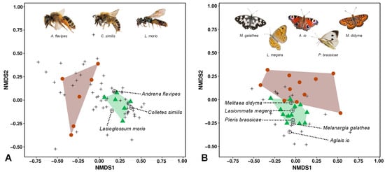 Differences in the similarity of wild bee and butterfly communities between GEVs and NEVs were observed (NMDS, Figure 4). These differences were highly significant for both insect groups (PERMANOVA, 999 permutations: (A) wild bees F = 3.142; df = 1; p = 0.003; (B) butterflies F = 3.142; df = 1; p = 0.003). Furthermore, the variability in the species composition of both wild bees and butterflies was significantly higher in NEVs (PERMDISP, 999 permutations: (A) wild bees F = 6.094; df = 1; p = 0.047; (B) butterflies F = 5.696; df = 1; p = 0.018).
