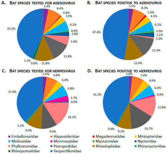 Percentage of bat species by family tested for (A) adenoviruses and (C) herpesviruses and bat species positive for (B) adenoviruses and (D) herpesviruses for the time period 1996–2022.