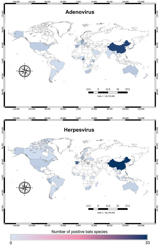 Regarding geographical patterns, the results of our screening indicate that despite a relatively wide coverage across continents in the study of AdVs and HSVs in bats, there are still quite important areas that have not been studied yet. In fact, there are many regions, particularly in central America, north Africa, west Asia, central Asia, north Asia, and Australasia, in which the search for AdVs and HSVs in bats was so far scarce or never carried out. This finding is quite surprising for some areas that are located in countries considered developed and indicates how far we still are from having gathered the basic information needed for the designing of future general antiviral strategies. The weakness in the sampling areas worldwide is followed by the lack of local research teams capable of carrying out studies aimed to detect not only adenoviruses or herpesviruses but also other viral families hosted by bats [131]. The most important research teams belong to US and Chinese institutions, followed by European researchers. This study points to the necessity of fostering local capacity for many countries in order to be able to establish efficient surveillance networks worldwide.