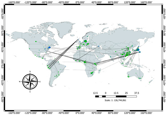 Spatial networks of study sites (green circles) and research teams (blue circles). The sizes of the circles reflect the number of studies of a specific site, and the arrows represent the direction from the research team to the study site, while the line width represents the number of papers published by each research team.