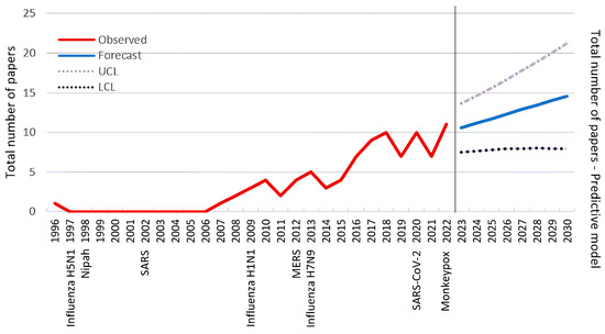 Number of published papers per year, including projections of the number of publications from 2023 to 2030, according to the Expert Modeler Method, indicating the Upper Control Limit (UCL) and Lower Control Limit (LCL). In addition, the figure highlights some epidemic/pandemic events reported by the World Health Organization.
